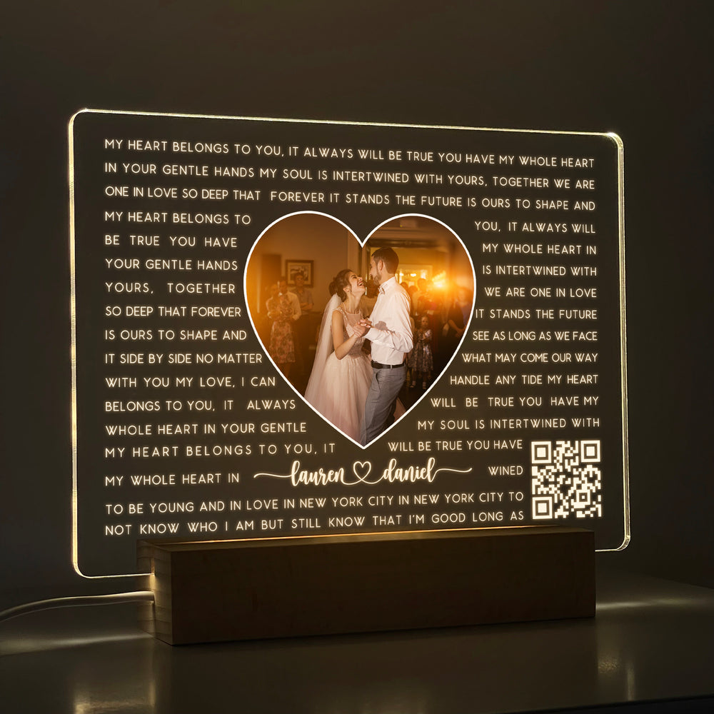 This custom LED acrylic plaque showcases your photo in a heart cutout, your engraved names and lyrics. Features a scannable QR code that links directly to your special song—perfect for first dances, wedding gifts, and anniversary surprises.