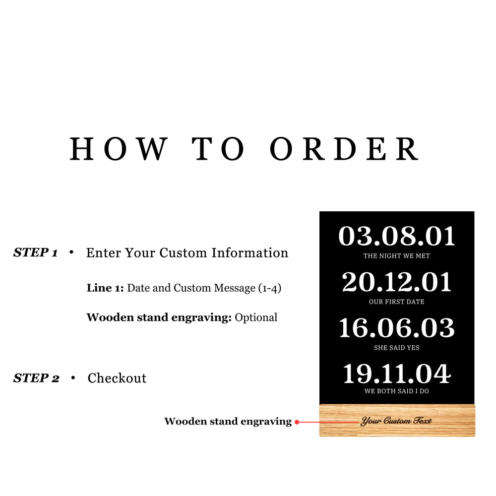 Turn your love story into a glowing timeline. This custom LED acrylic plaque features your four milestone dates in bold type with short captions beneath each (e.g., The Night We Met, Our First Date, She Said Yes, We Both Said I Do). Warm lighting on a wooden base creates a cozy keepsake for bedrooms, shelves, or wedding decor—perfect for anniversaries, engagements, or as a gift for couples.