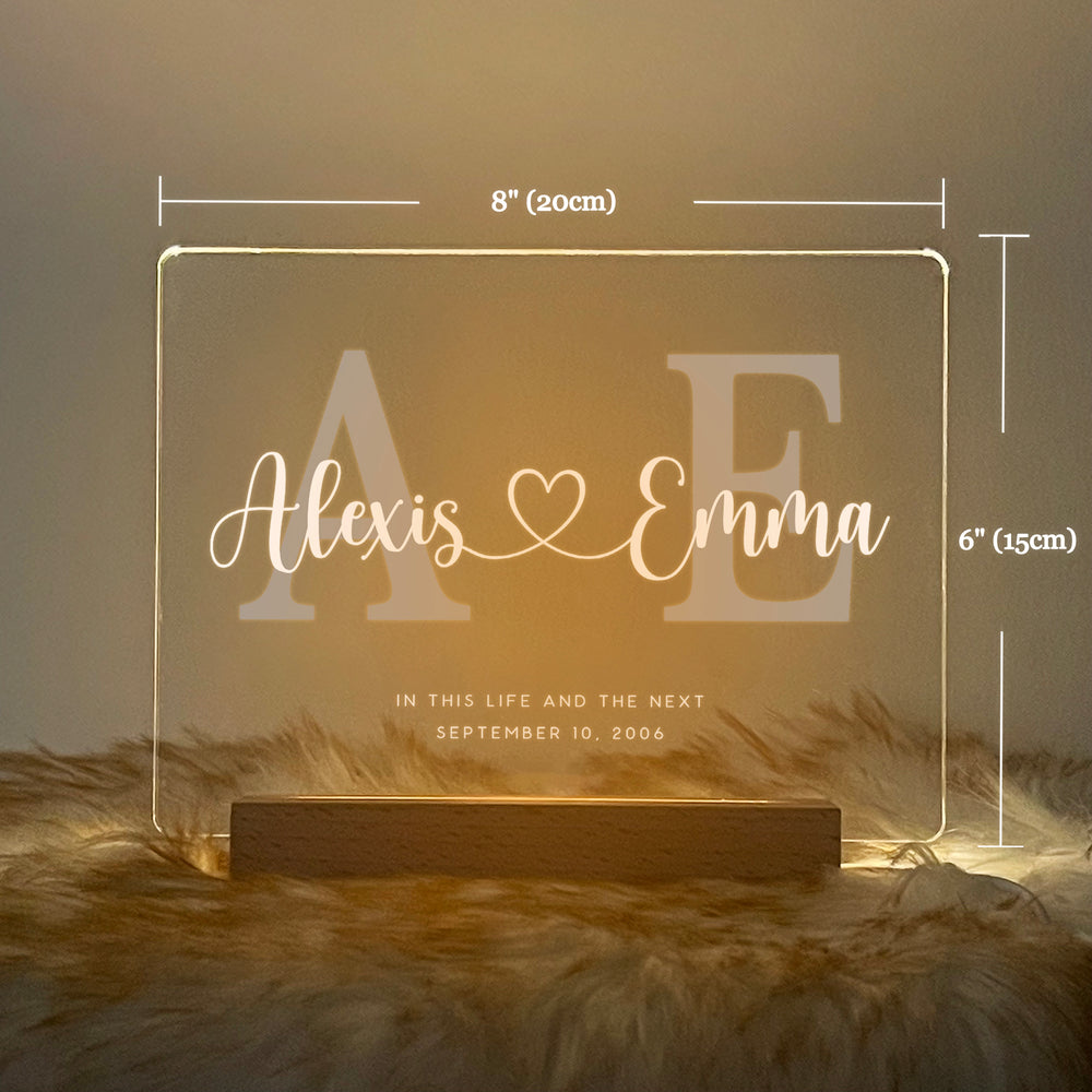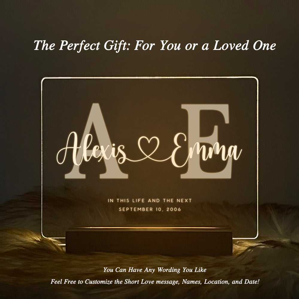 A timeless, minimalist keepsake for two. This LED acrylic plaque showcases your bold monogram initials behind elegant script names, with a short quote and special date beneath. The warm glow on a wooden base adds cozy ambience to bedrooms, shelves, or wedding decor—perfect for anniversaries, engagements, or newlyweds.