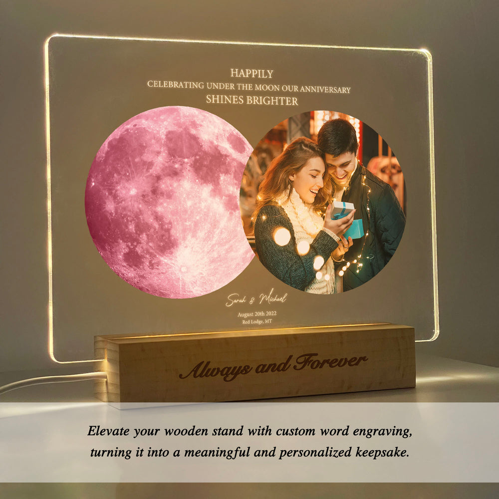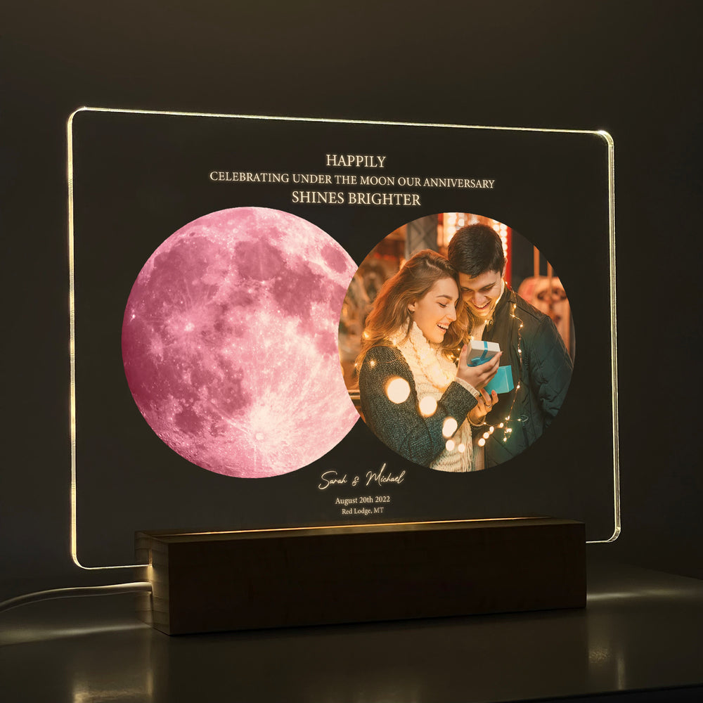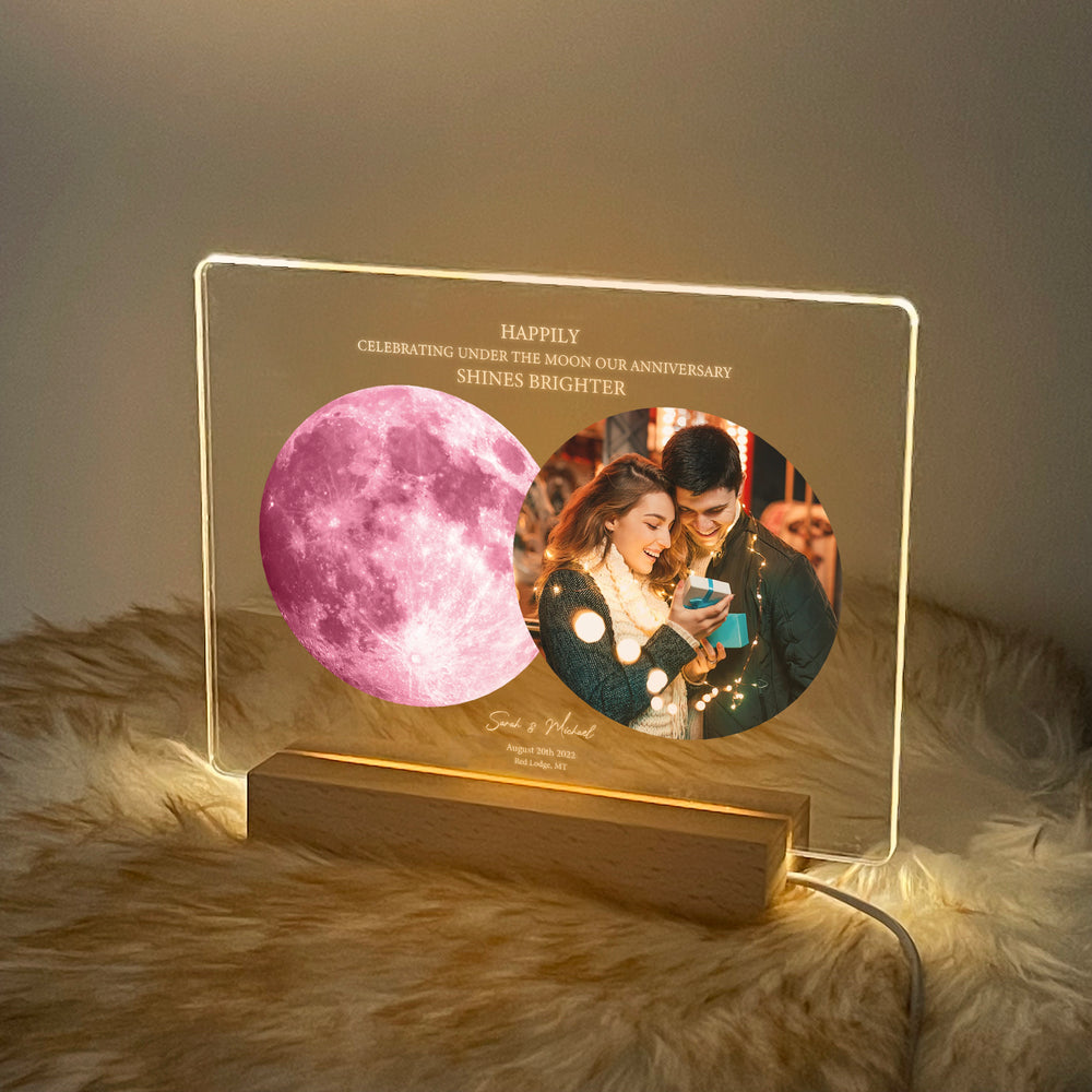 Celebrate your love under the moon that shone on your special night. This custom acrylic lamp pairs your favorite photo with the exact moon phase generated from the date you provide. Personalize with names, date, and location for a glowing keepsake perfect for anniversaries, engagements, weddings, or Valentine’s Day.