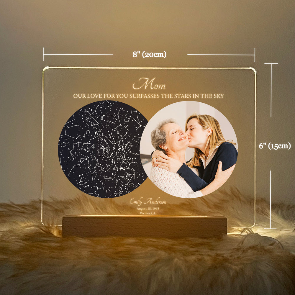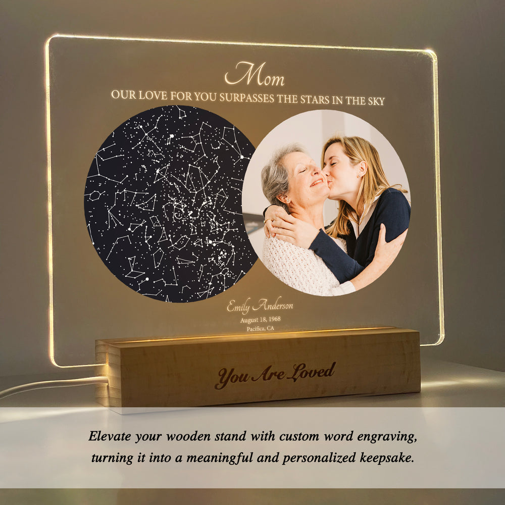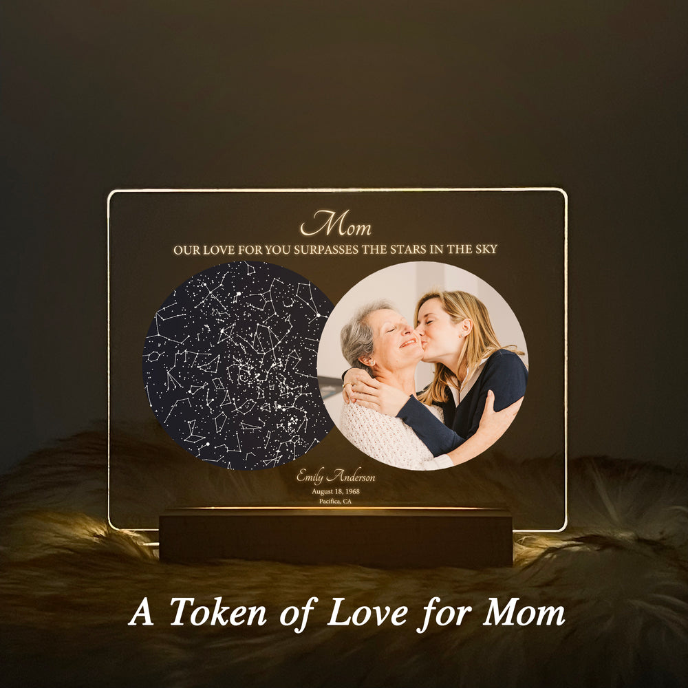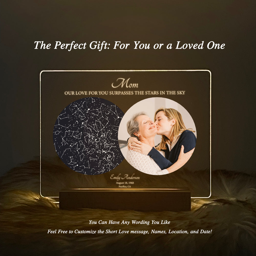 Celebrate the moments that meant everything to Mom—your first steps, a birthday, a graduation, or any milestone—with a personalized star map night light. Each piece is custom-made to show the exact night sky for the date, time, and location she holds dear. Graceful by day and softly glowing by night, it brings a celestial touch to her space and a lasting reminder of how loved she is.