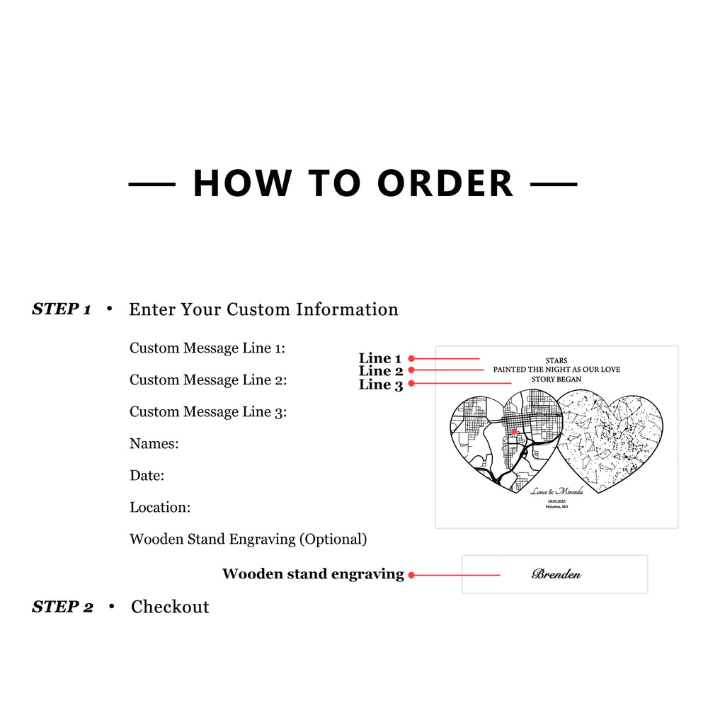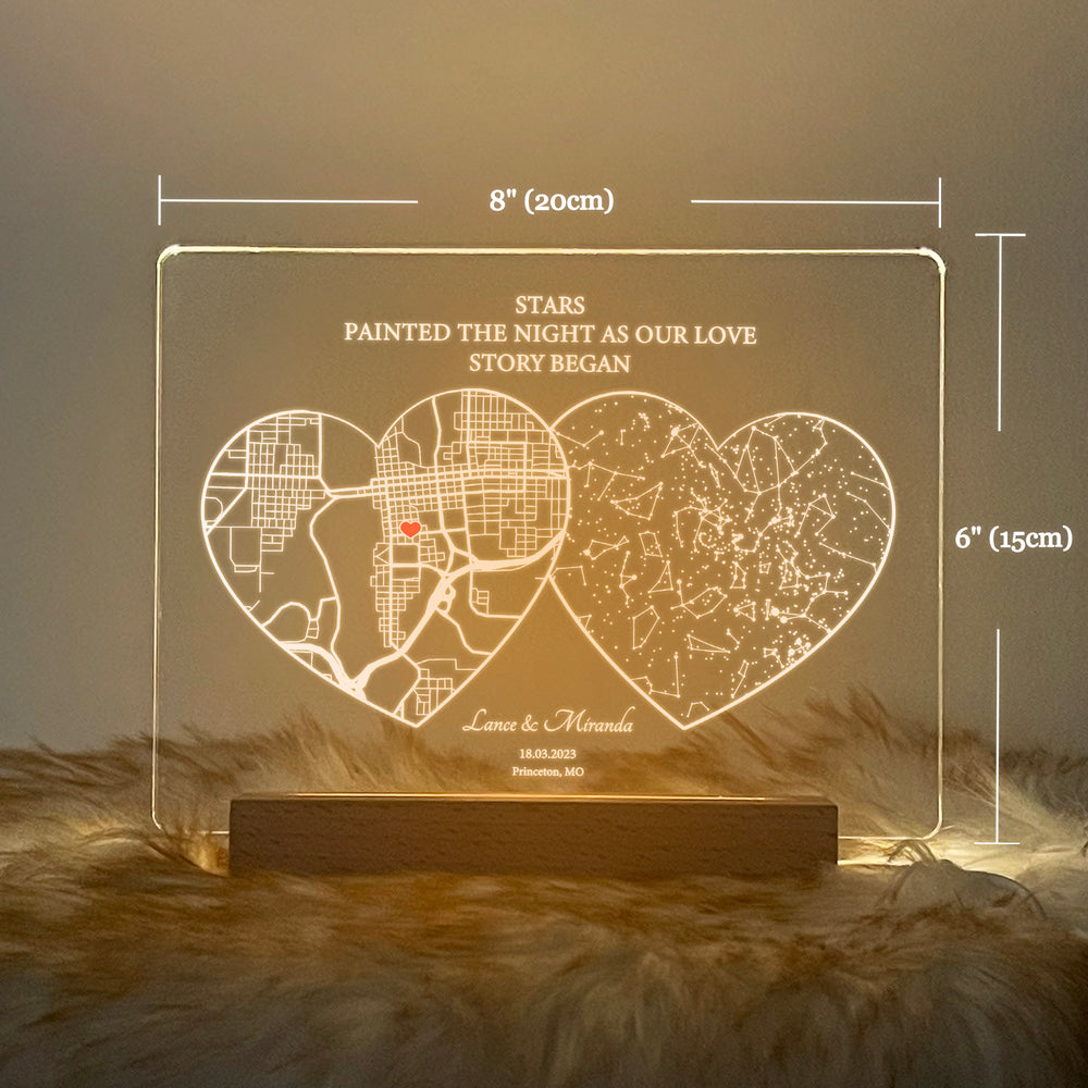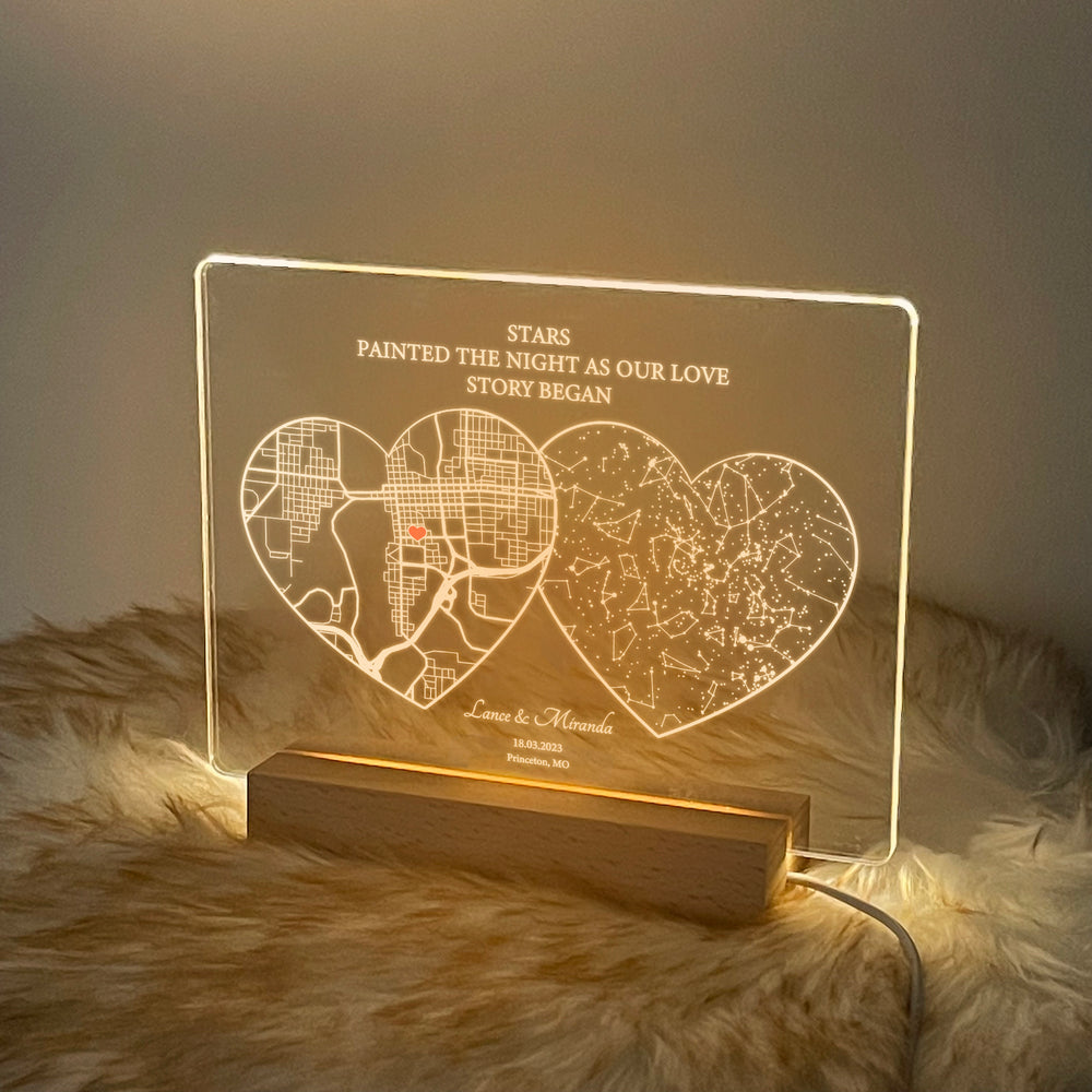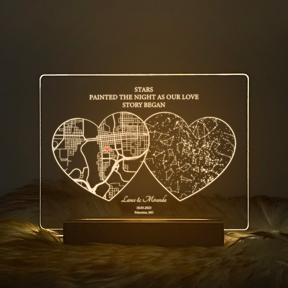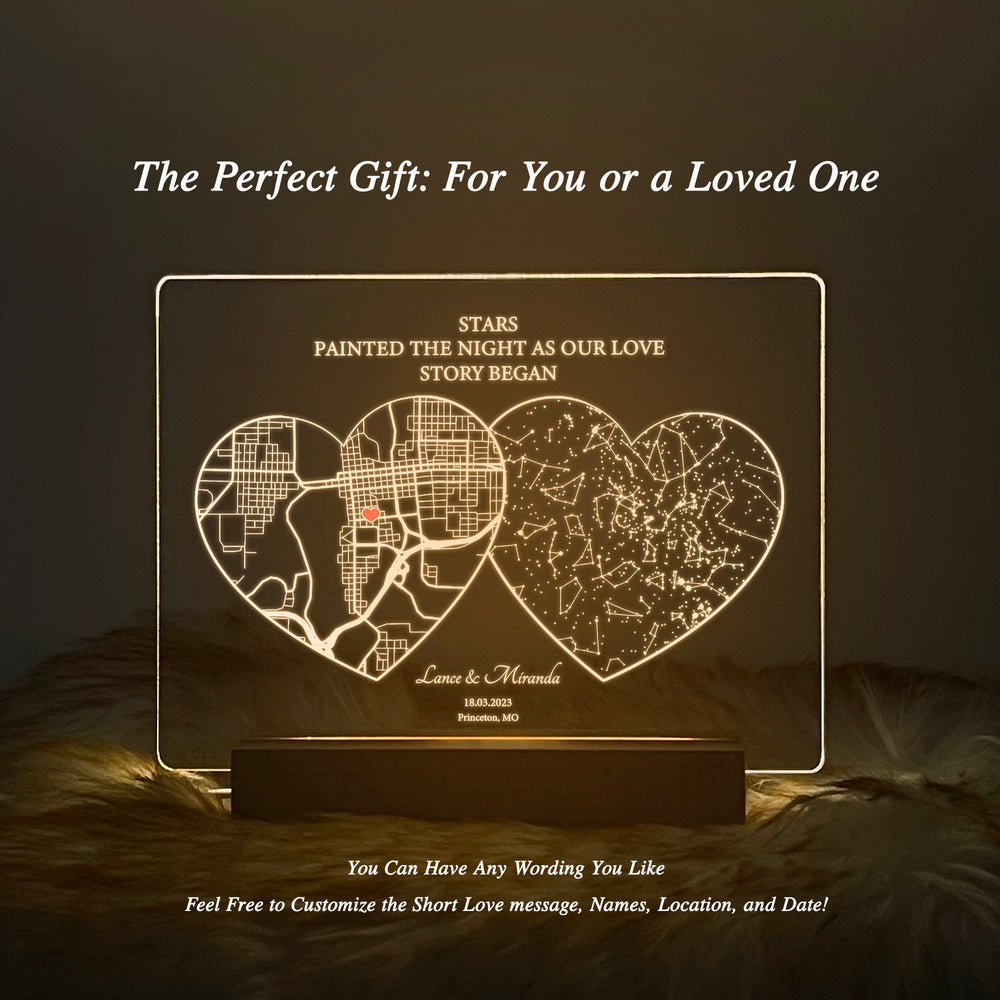 Commemorate the place and night your story started with a personalized acrylic night light. One heart features a custom street map with a pinpoint of your special location; the other captures the exact night sky for your chosen date, time, and place. Soft, warm illumination highlights your custom names, date, and location—perfect for anniversaries, weddings, engagements, or a romantic keepsake.